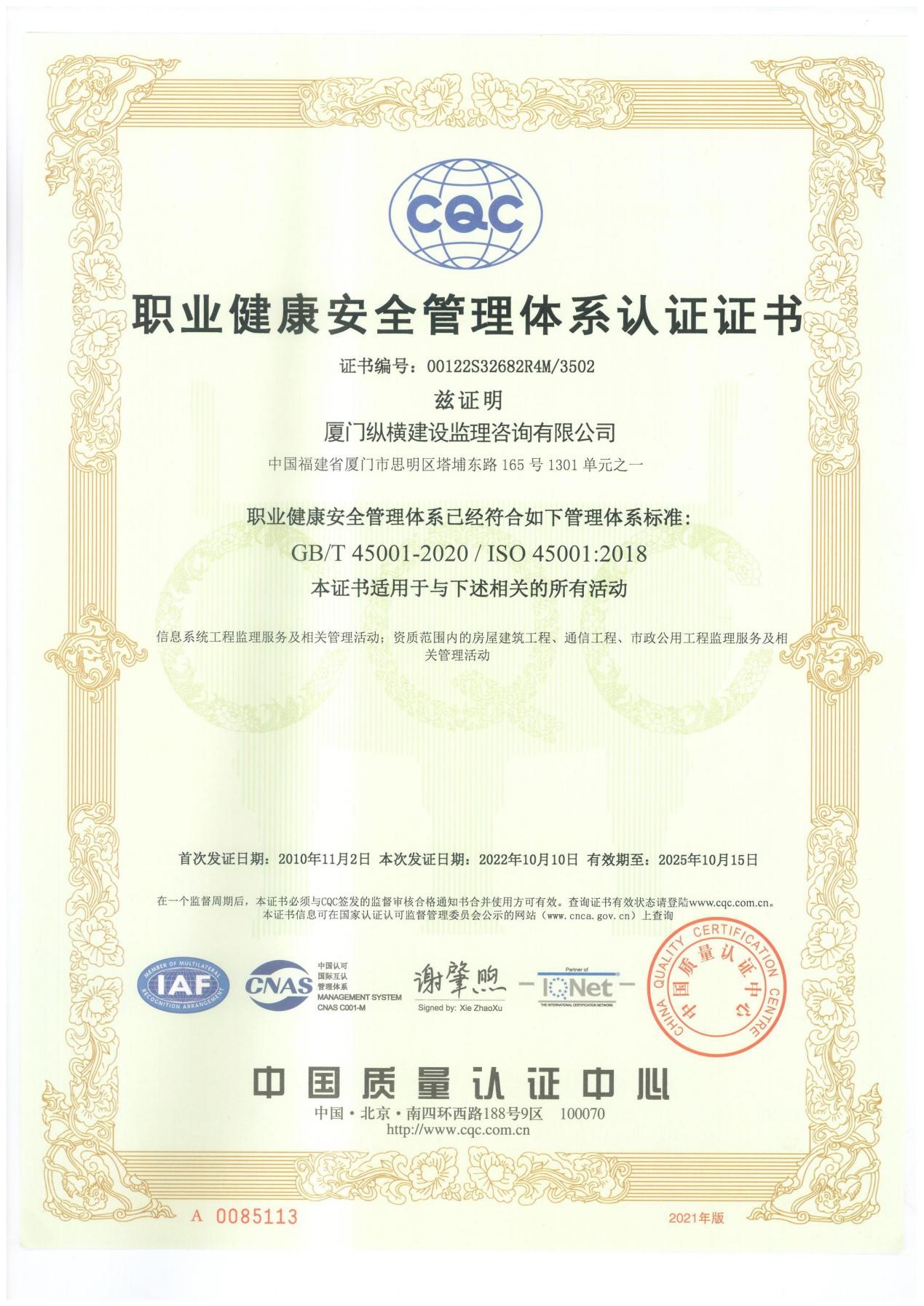 职业健康安全管理体系认证证书